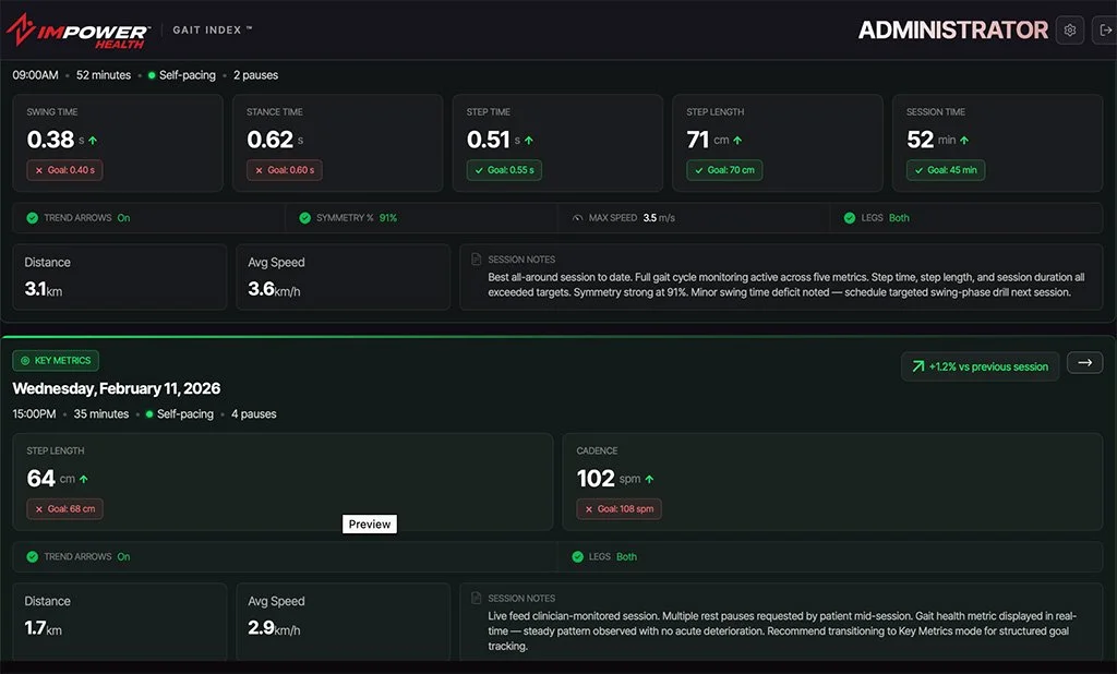 Impower Health fundamentally changes this by transforming the world’s most common piece of exercise equipment – the treadmill – by providing objective insights without cameras, wearables, or workflow disruptions. Our patented Gait Index™ software enables earlier detection of mobility decline and accelerates recovery by bringing objective, reimbursable data directly into everyday clinics